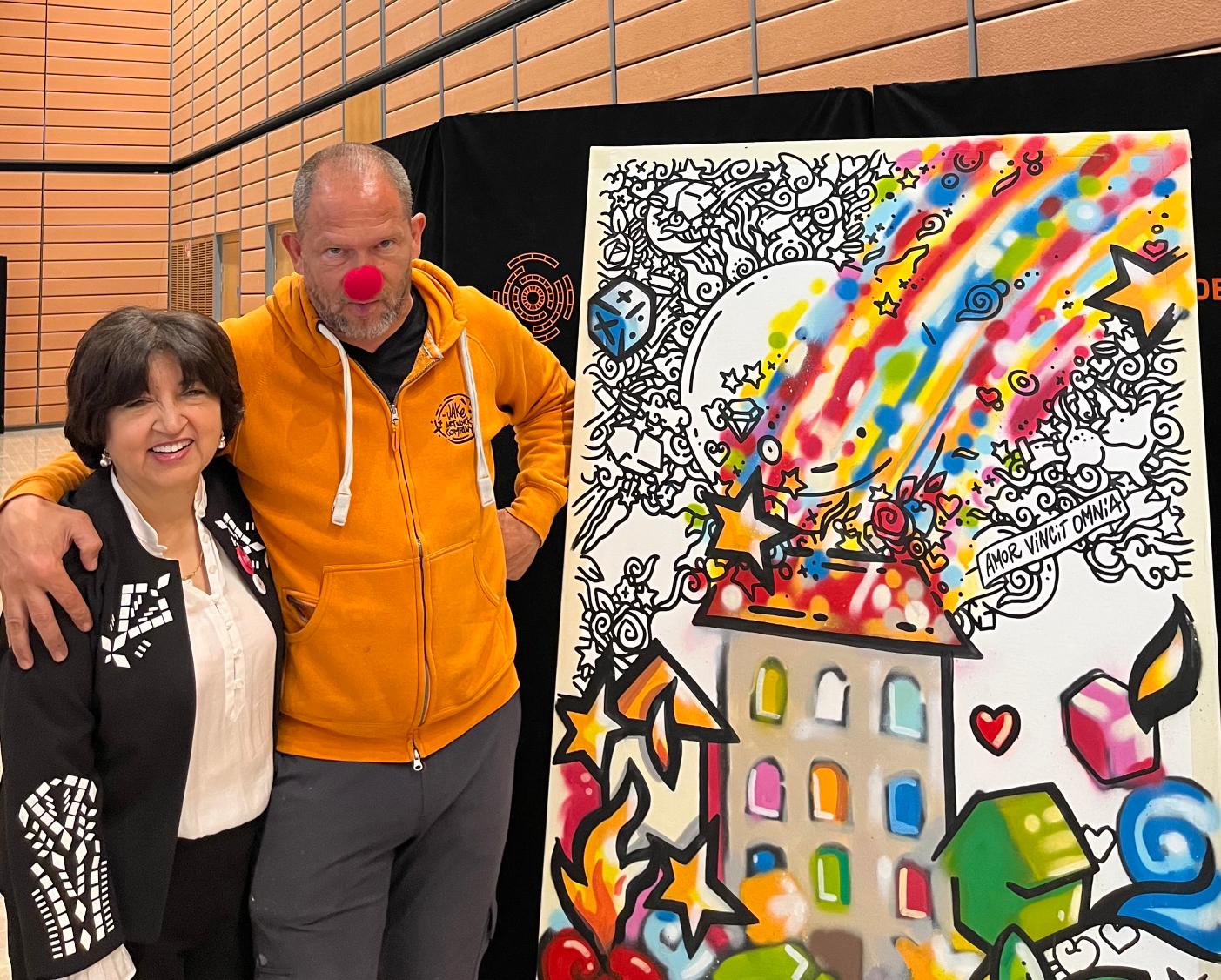 Autre temps fort de la journée, la présence de l’artiste urbain contemporain Jakè qui a réalisé sur place une œuvre unique pour l’événement. Le tableau a ensuite été mis aux enchères lors de la soirée de rentrée de l’UNIS et été acquis pour 10 000€ par l’agence immobilière Régie Pedrini, au profit de docteur CLOWN !